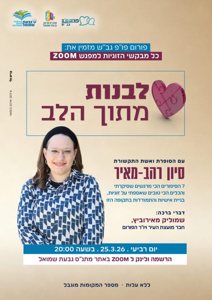 יוזמה נוספת של פורום פנויים-פנויות (פו”פ) בגבעת שמואל אותו מוביל חבר מועצת העיר שמוליק מאירוביץ’, תפגיש השבוע את מבקשי הזוגיות בעיר ובסביבה עם אחת המרצות המובילות והמבוקשות בישראל. ביום רביעי הקרוב, 25 במרץ בשעה 20:00, ייערך מפגש זום מיוחד תחת הכותרת “לבנות מתוך הלב”, בו תתארח הסופרת ואשת התקשורת סיון רהב-מאיר.